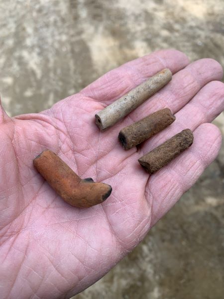 كانت الفئة التالية من القطع الأثرية التي وجدناها في الموقع مرتبطة بتدخين التبغ. في خط الماء، وعلى امتداد صغير من الرمال، وممزوجًا بشظايا السيراميك، وجدت أربع شظايا من غليون التبغ. تضمن أحدهم أيضًا جزءًا من وعاء الأنابيب. ومن المثير للاهتمام أن الأربعة كلها مصنوعة من الطين المحلي. غالبًا ما ترتبط ثلاثة في الأسلوب بتصنيع الأنابيب الأمريكية الأصلية، وهي مصنوعة من الطين الأحمر المحلي والتشطيب الدائري. وكان هناك أيضًا واحد من طين Virginia، ولكن نسخة أخف وزنًا، مع ملمس أقل حبيبيًا ونهاية مصقولة. بدا هذا الأنبوب أشبه بالأنابيب التي صنعها صانعو على طول نهر جيمس.