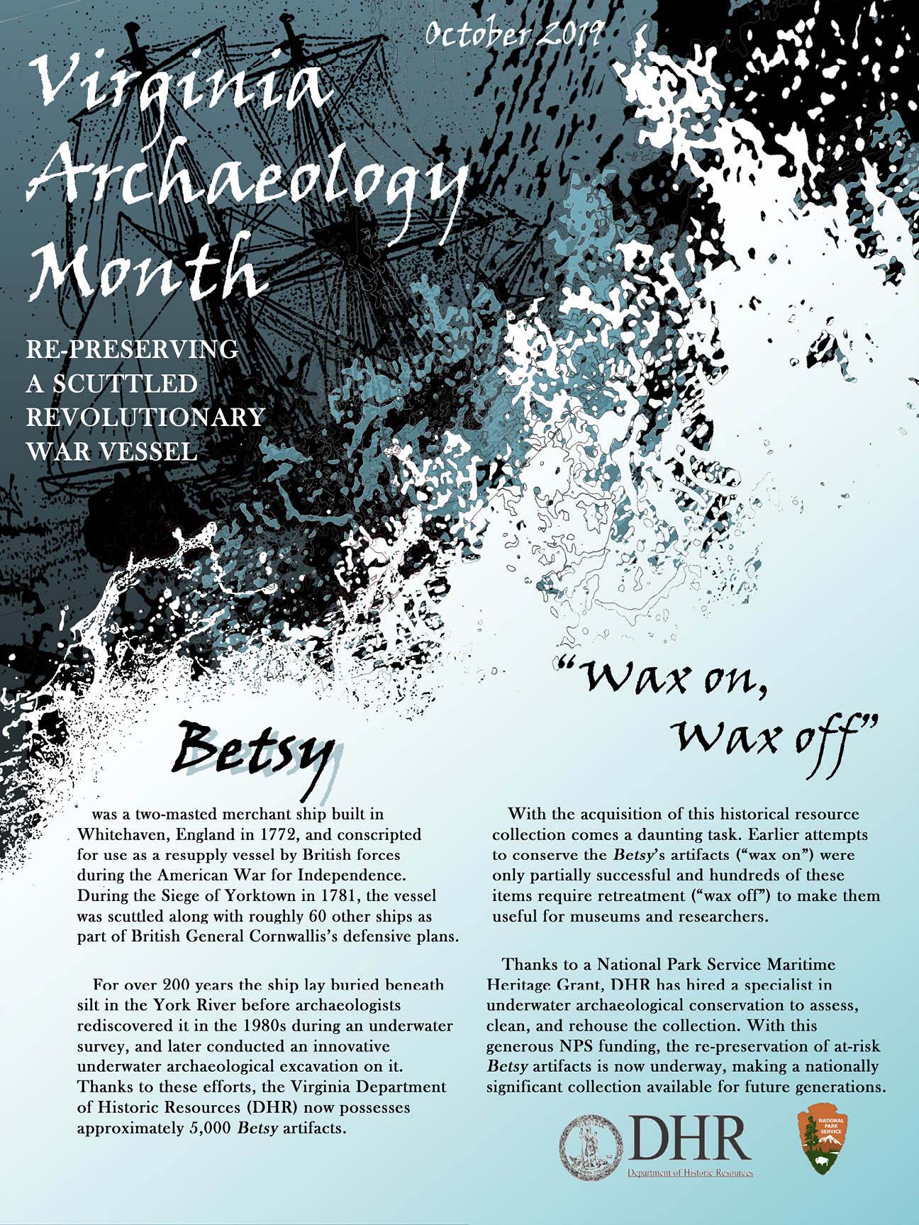 في أواخر العام الماضي، زار الدكتور "مينز" قسم الآثار البحرية في DHR 3-D لمسح أغراض من سفينة بيتسي (DHR #44YO0088)، وهي سفينة أُغرقت في نهر يورك في 1781 أثناء معركة يوركتاون التي قام عالم الآثار تحت الماء في DHR بالتحقيق فيها في 1980s. نحن نعمل الآن بنشاط على إعادة جمع تلك القطع الأثرية الخاصة ببيتسي وإعادة حفظها، وهو مشروع كان محور ملصق شهر الآثار (أكتوبر) العام الماضي، وعدد من التدوينات السابقة الجذابة. تم3 نشر صور الدكتور مينز -D لقطع من بيتسي على موقع مختبر التنظيم الافتراضي على الإنترنت حيث يمكن للمشاهدين تدوير وتكبير كل واحدة منها على الإنترنت. في الواقع، أصبحت القطع الأثرية التي كانت مدفونة في قاع نهر يورك متاحة الآن في جميع أنحاء العالم.