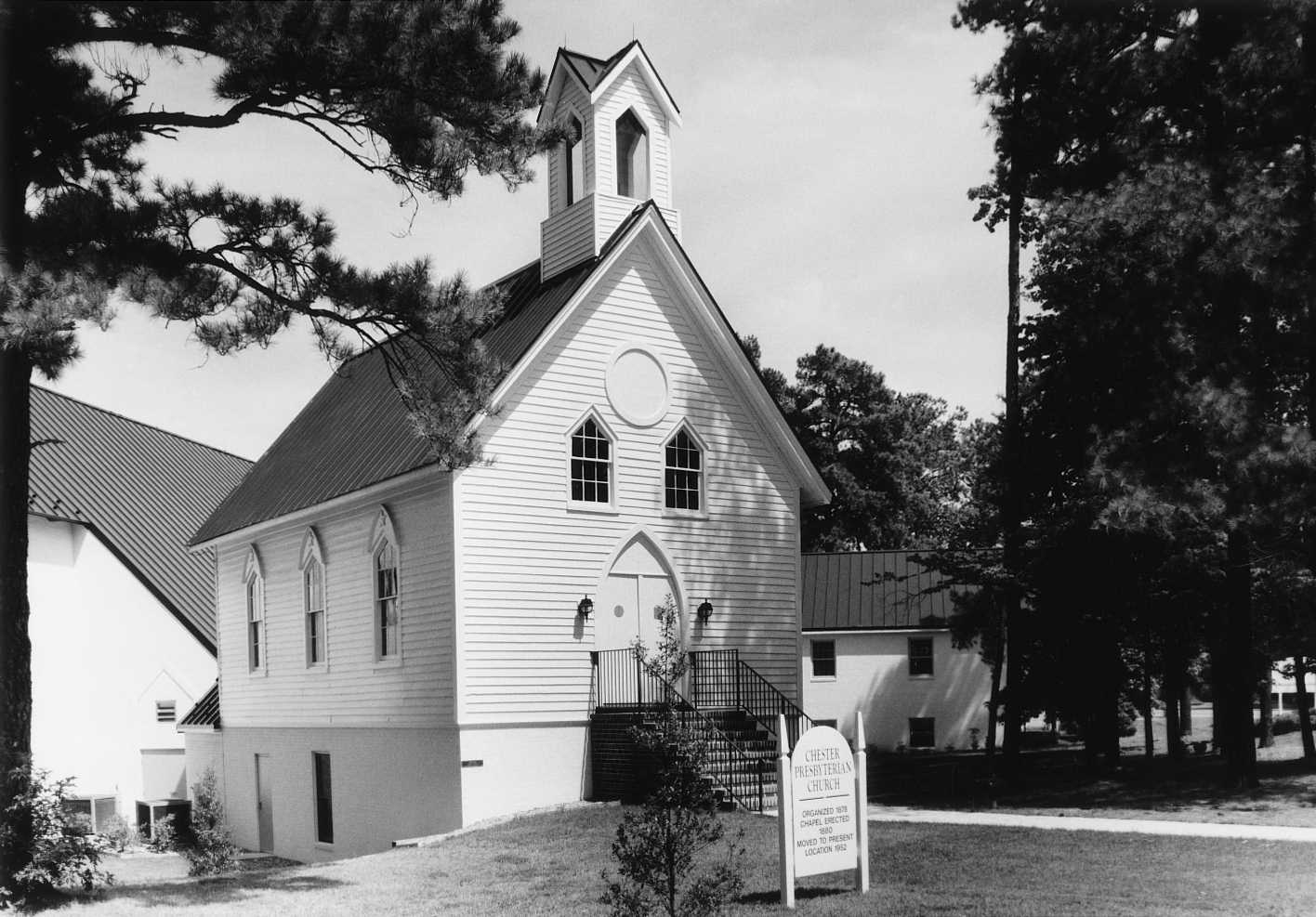 وقد خدم هذا المبنى البسيط ذو الطراز القوطي المُعاد إحياؤه مجتمع تشيستر في مقاطعة Chesterfield منذ أواخر القرن 19. بُنيت الكنيسة في 1880 بمفرده تقريبًا على يد مارتن ت. غروف، وهو واحد من مجموعة من الباحثين عن الثروة الشماليين الذين أحضروا عائلاتهم إلى منطقة تشيستر بعد شائعة بأن الجنرال بنجامين بتلر ترك وراءه صندوقًا عسكريًا مدفونًا يحتوي على80000 بعد الحرب الأهلية. لم يكتشفوا أي أموال، لكن بعضهم أصبحوا أعضاء مؤسسين لكنيسة تشيستر المشيخية في 1878. كانت الكنيسة في بعض الأحيان مكانًا مؤقتًا لاجتماعات الميثوديين والمعمدانيين. تم نقله إلى موقعه الحالي من موقعه الأصلي على طريق وينفري في 1954. في عام 1995 تم تغيير موقع المبنى وتجديده ليصبح نقطة محورية لمجمع مقدس جديد. لا تزال المقاعد الأصلية مستخدمة حتى الآن.