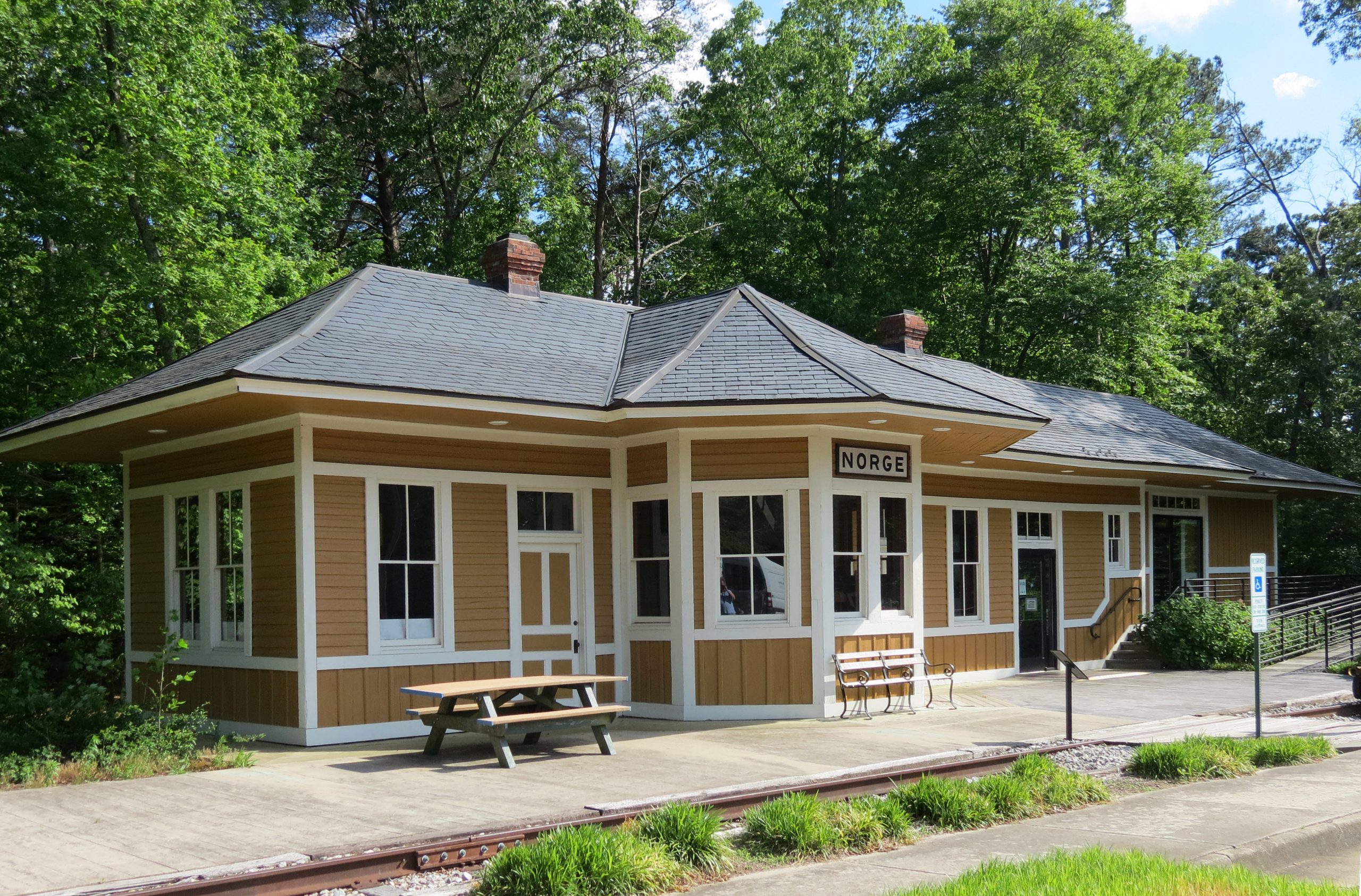 يُعد مستودع قطارات نورج مثالاً جيداً على الهندسة المعمارية الموحدة التي استخدمتها السكك الحديدية في أوائل 20القرن العشرين. قبل إنشائه في حوالي 1908 ، كان على سكان نورج السفر لمسافة ميلين غربًا إلى بلدة توانو من أجل اللحاق بقطار الركاب. مع تدفق المهاجرين النرويجيين إلى المنطقة في 1896 ، أصبح وجود مستودع محلي للركاب على خط تشيسابيك & أوهايو ضرورة. على الرغم من أن المبنى كان من الإنتاج الضخم، إلا أنه كان متيناً وأنيقاً كما هو واضح اليوم في سقفه والتصميمات الداخلية لغرف الانتظار والخليج المائل الذي كان يميز مكتب وكيل القطار. يُعد المستودع أيضًا مثالاً جيدًا على ما كان يُعرف باسم "المحطة المدمجة"، وهو مبنى يمكن تخصيصه لخدمة الاحتياجات الإقليمية لموقعه. وفي مواجهة خطر الهدم، تم نقل المبنى بعيدًا عن السكة الحديد في أوائل 2006 إلى موقعه الحالي بالقرب من مكتبة مقاطعة جيمس سيتي، حيث تم ترميمه.