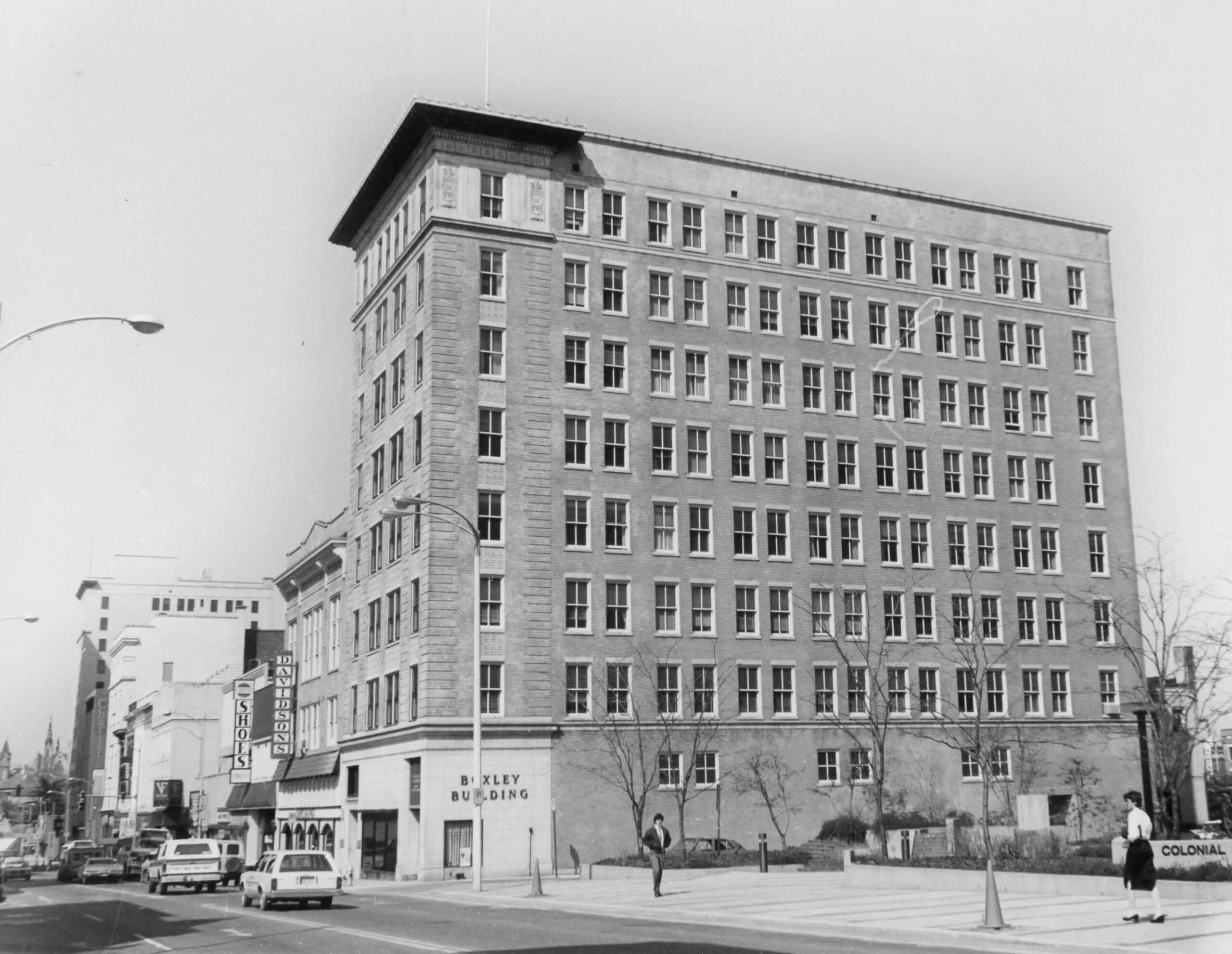 شُيد مبنى بوكسلي في رونوك في 1921-22 ، في "العصر الذهبي للتقدم البلدي" للمدينة، والذي حدث في العقد الذي أعقب الحرب العالمية الأولى. يحتوي المبنى المكون من ثمانية طوابق على طابق أول ذو واجهة من الجرانيت مع طوب بيج مطلي بالمينا وزخارف من الطين فوقه، ويعلوه إفريز نحاسي عميق. قام بتصميمه المهندس المعماري فرانك ستون الذي كان يعمل بالشراكة مع إدوارد ج. فراي. كان ستون قد عمل سابقًا في شركة D.H. Burnham في شيكاغو، ويعكس تصميمه تأثير المباني الشاهقة الرائدة في شيكاغو. كان المبنى بتكليف من دبليو دبليو بوكسلي، المطور ومالك المحجر ومقاول السكك الحديدية وعمدة رونوك وقت بنائه. وقد حرص بوكسلي على استخدام أجود المواد المتاحة لهيكله ذي الإطار الفولاذي، مما أدى إلى إنشاء عمل لا يزال سمة بارزة في أفق المدينة وفي منطقة رونوك التاريخية المدرجة في قائمة منطقة وسط المدينة.